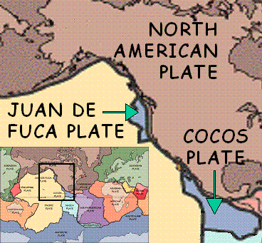 plate boundaries off the Pacific North-east and Canada. Note that the Cascadia subduction zone is also called the “Filled Trench”, as this trench got filled by sediments carried by the huge runoff from land that has characterized this region particularly since the Last Ice Age. |